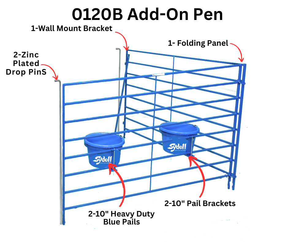 The Sydell 0120B Folding Add-On Pen is designed to seamlessly expand your lambing and kidding setup for sheep and goats , providing additional pen space and flexibility during birthing season. Commonly used to extend the Sydell Folding Starter Pen (Model 120A) , this add-on pen allows you to create a continuous row of wall-mounted pens while maintaining an organized, space-efficient barn layout.