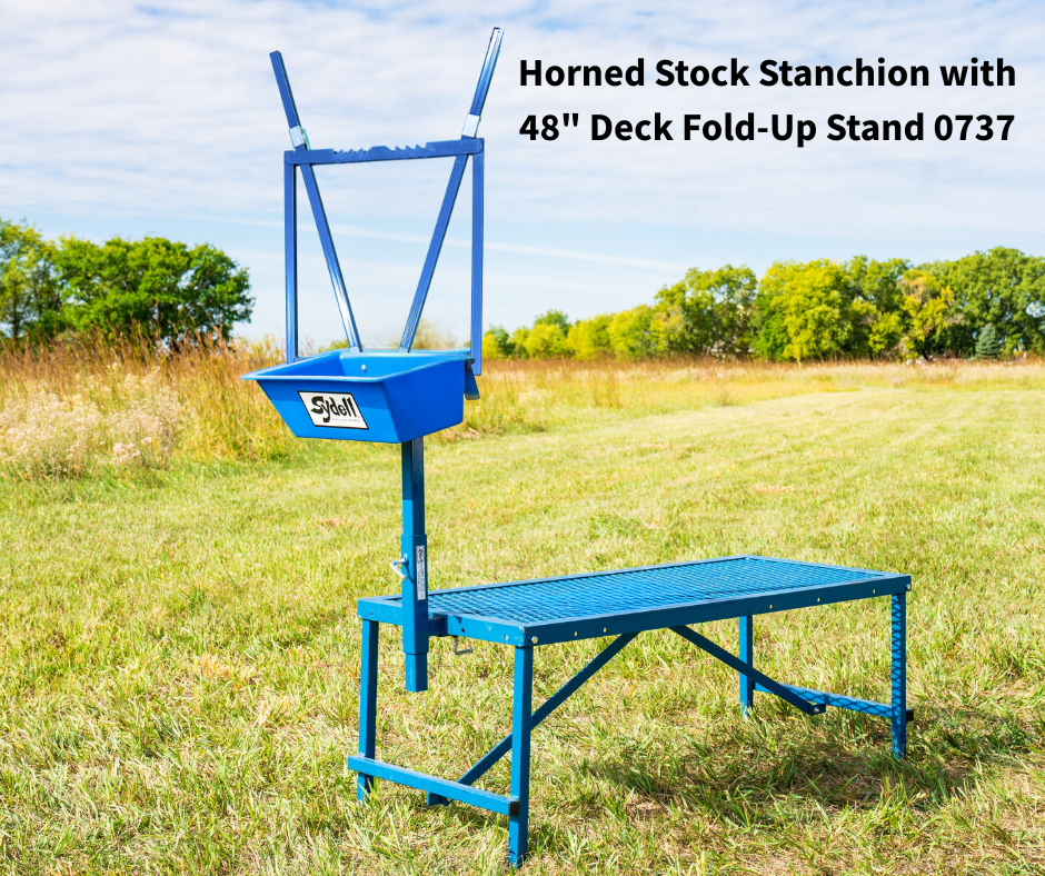 The stanchion features a large, horn-friendly headpiece opening that allows horns to pass through freely, reducing stress on the animal while keeping them properly secured. Paired with your choice of a 36" or 48" Deck Fold-up Stand, this setup offers flexibility for different breeds, facilities, and working preferences.